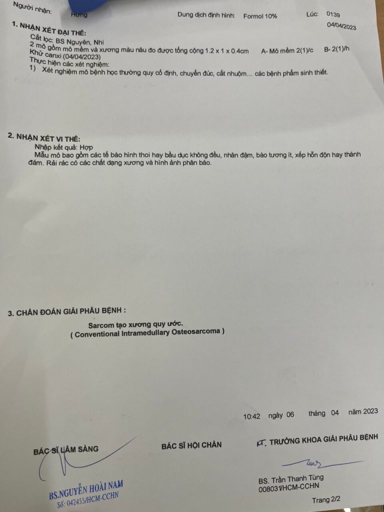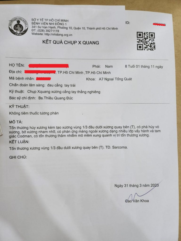 Hơn 5 ngày sau, bé Nấm vẫn âm thầm chịu đau, chỉ khi có người hỏi thì mới nói “đau chút chút”. Đúng dịp bé bị sốt siêu vi, gia đình đưa đi khám tại Bệnh viện Nhi Đồng 1. Khi khám xong, do vẫn còn sớm và bệnh viện không quá đông, chúng tôi quyết định chụp X-Quang tay của bé cho yên tâm. Kết quả cho thấy “nghi ngờ U xương Sarcoma”. Lúc đó, cả nhà vẫn chưa hình dung được mức độ nguy hiểm, chỉ nghĩ đây có thể là chẩn đoán nhầm nên tiếp tục chờ gặp bác sĩ chuyên khoa để nghe giải thích rõ hơn.
